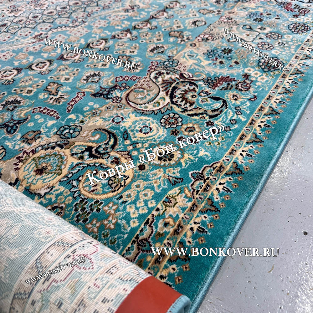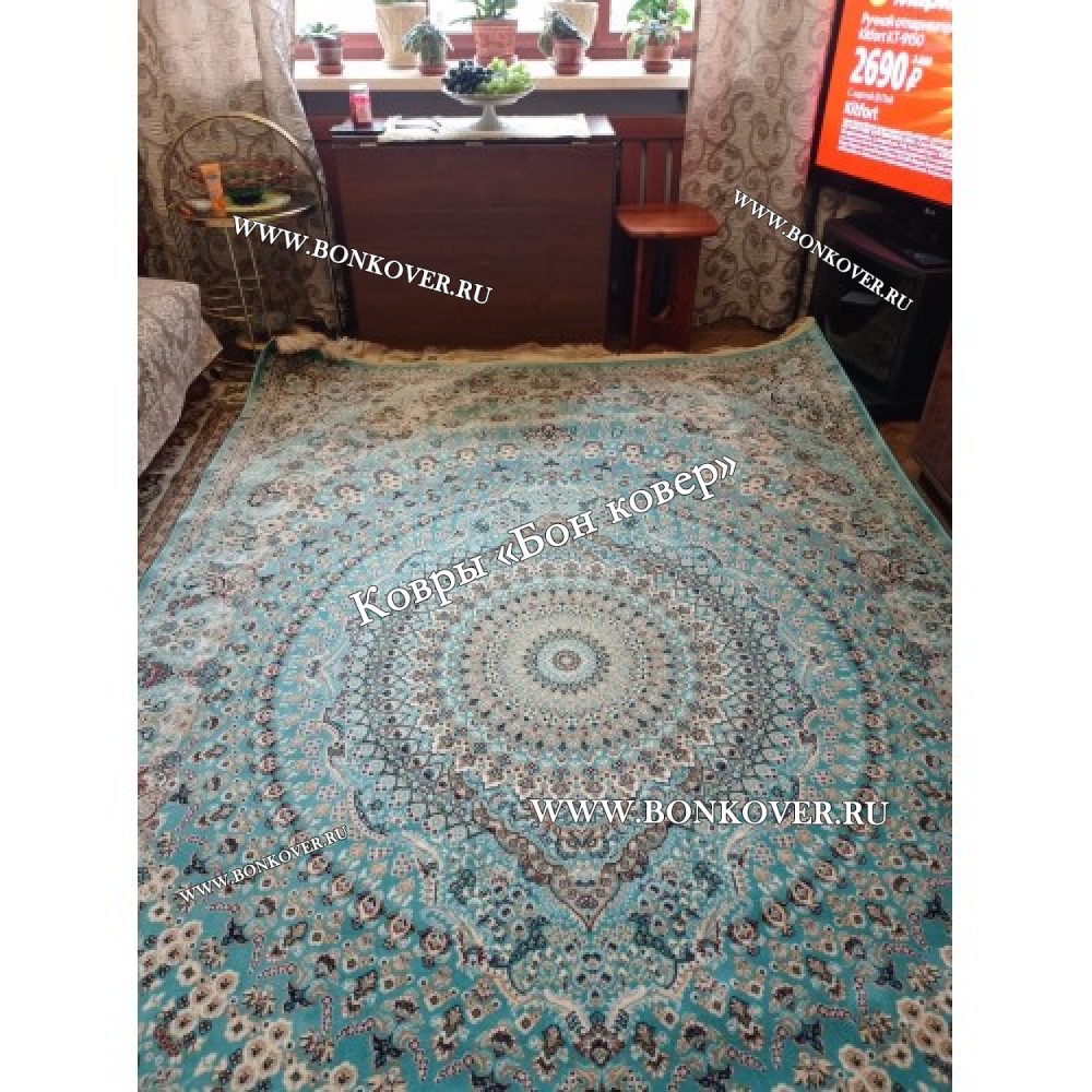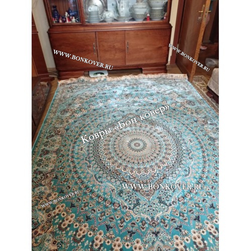 Красивый Восточный Ковер Для Гостиной Медальон Дизайн 28767 Бирюзовый наполняет интерьер помещения теплом и уютом, гармонично сочетает в себе изящество и стиль. Он создан из экологически чистого сырья, прочный и долговечный.